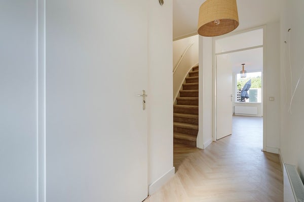 Voortuin (2,68x5,92), entree woning, hal (3,64x1,16) met meterkast, modern toilet met fontein, ruime lichte woonkamer (5,82x5,64) met een visgraat laminaat vloer, toegang tot een goed onderhouden grote achtertuin met stenen schuur en achterom. Aan de voorzijde bevindt zich de moderne keuken (4,34x3,4) voorzien van een nieuwe combi-magnetron, een nieuwe vaatwasser, 4-pits gaskookplaat en afzuigkap.