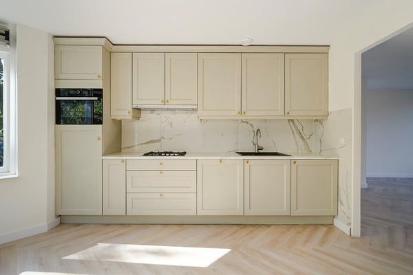 Keuken: Moderne keuken met inbouwapparatuur waaronder, 4 pits kookplaat, afzuigkap, vaatwasser en een combi-magnetron.