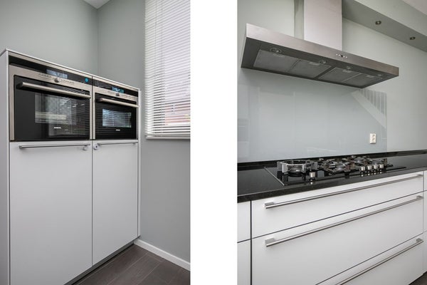 De moderne L-vormige keuken is van alle gemakken voorzien en beschikt over een handige bar. Het omvat verschillende inbouwapparaten zoals een gaskookplaat met afzuigkap, vaatwasser, stoomoven, combinatie van magnetron/oven, twee koelkasten en een vriezer.