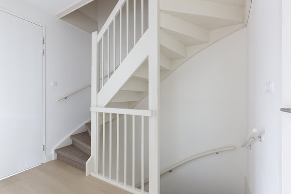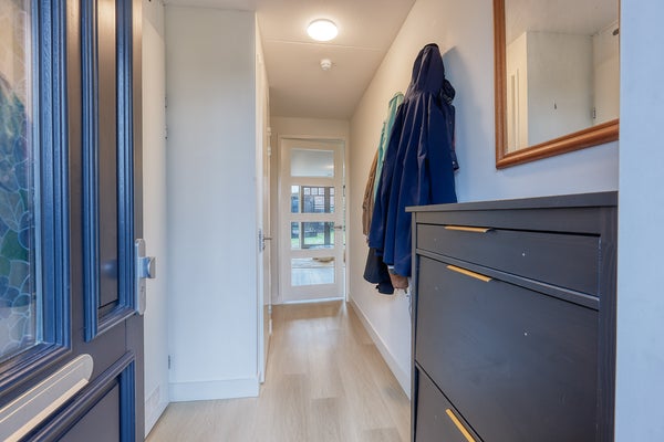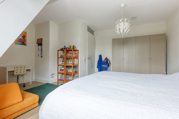 De royale woonkamer is ontzettend licht en beschikt over een fijne ingebouwde bergkast. De kamer kijkt uit over de riante achtertuin van ca. 60 m2. De achtertuin ligt op het noordwesten en beschikt over een schuur en een achterom. De achterom leidt naar het achtergelegen parkeerterrein waar de vaste parkeerplaats zich bevindt.