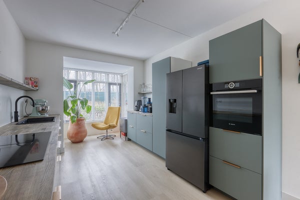 De moderne en unieke open keuken is van alle gemakken voorzien en beschikt over een inductie kookplaat met geïntegreerde afzuiging, Quooker, oven, vaatwasser en Amerikaanse koel-vriescombinatie met waterdispenser. Aan de voorzijde is een gezellige nis die uitkijkt over de voortuin en het water, de ideale plek om een knus zitje te creëren.