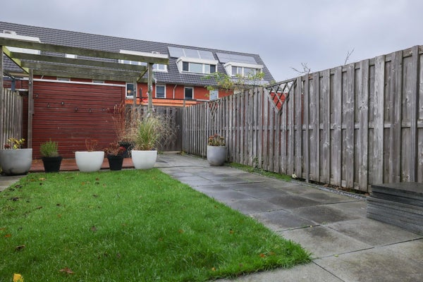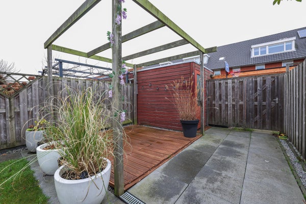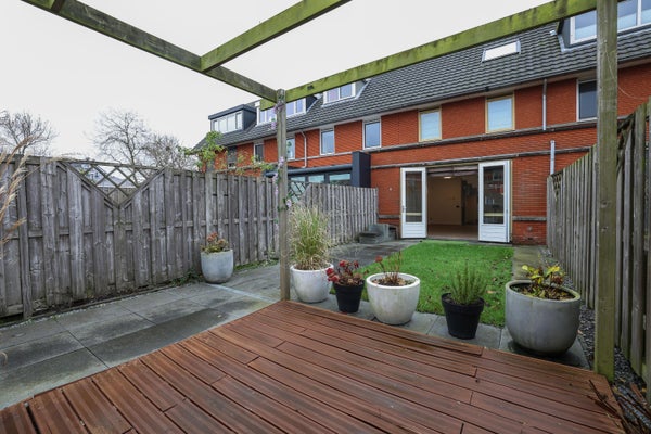 De achtertuin is verzorgd aangelegd met grote tegels, heeft een mooie maatvoering en ligging op het zuidoosten, waardoor u vrijwel de hele dag kunt genieten van de zon. Tevens is er een achterom aanwezig, alsmede een houten berging voorzien van elektra.
