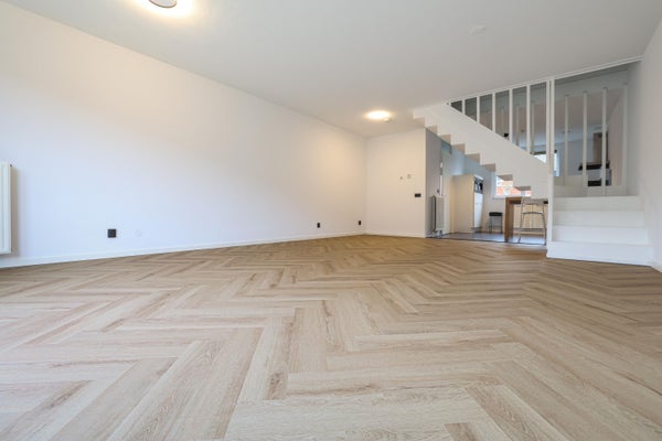 - De woonkamer wordt voorzien van een nieuwe lichte kleur visgraat pvc vloer en eerste etage nieuw lichte kleur laminaat;