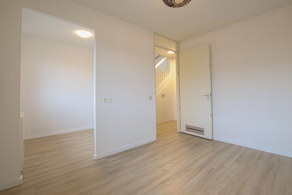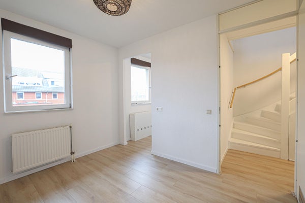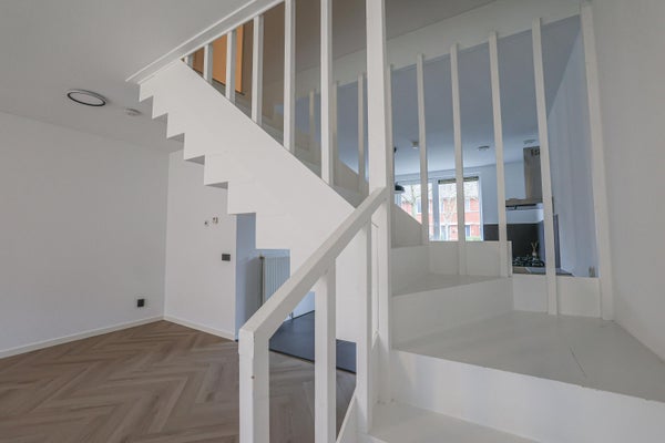 De open trap is direct de scheiding tussen de keuken en de woonkamer. De ruime woonkamer is voorzien is van een laminaatvloer en dubbele deuren naar de achtertuin.