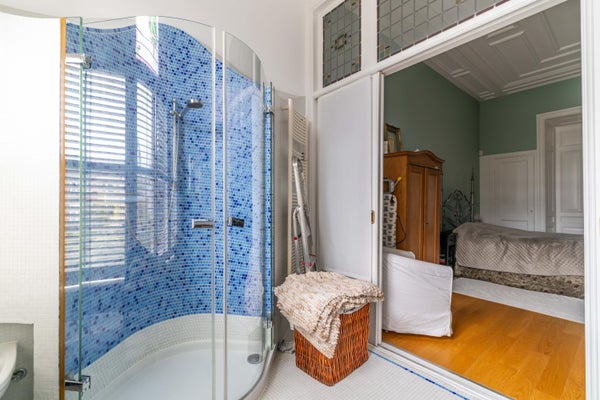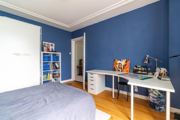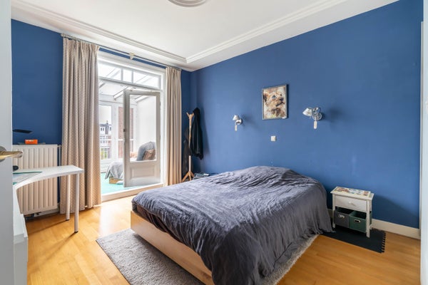 Ruime overloop met modern toilet. De lichte (hoofdslaap)kamer aan de voorzijde beschikt over een fraaie parketvloer, ornamenten plafond, schouw met gashaard en openslaande deuren naar het balkon. De tweede (hoofd)slaapkamer heeft een en-suite badkamer met ruime douche, dubbele wastafel en bidet.