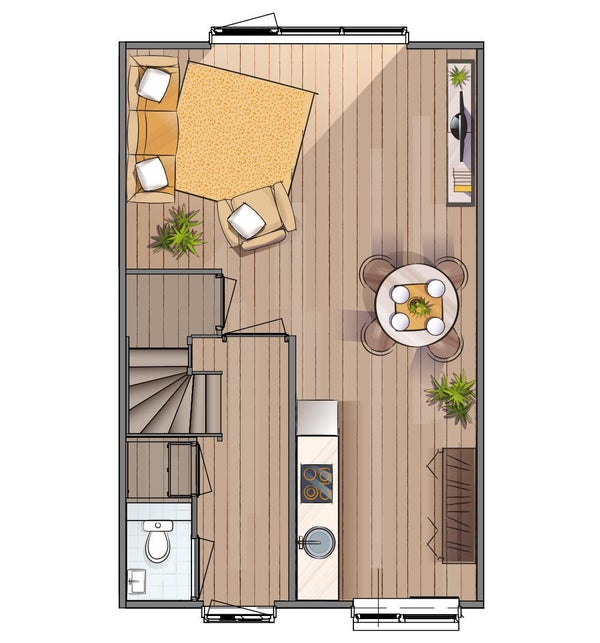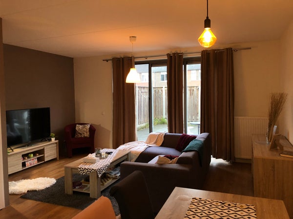 - Woonkamer gelegen aan de tuinzijde van de woning met trapkast;