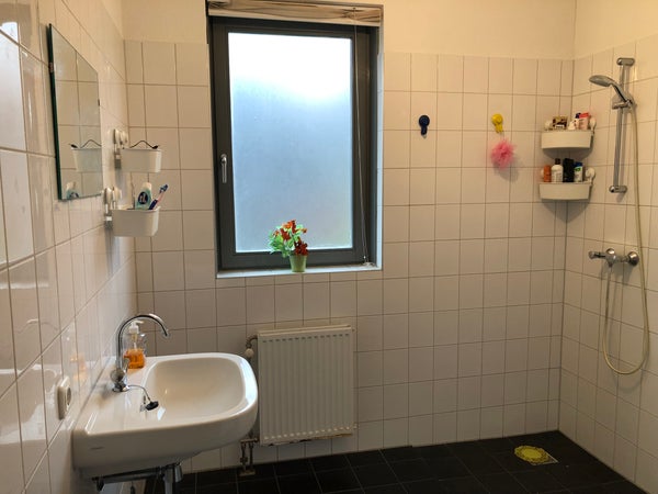 - (Deels) betegelde badkamer voorzien van inloopdouche, hangend toilet en vaste wastafel. De badkamer beschikt tevens over een raam voor natuurlijk daglicht en ventilatie.