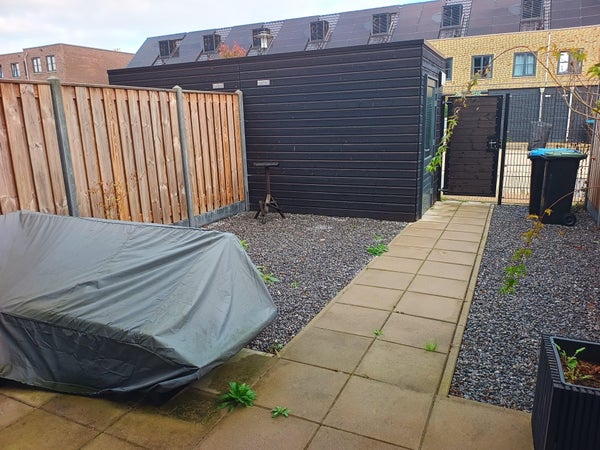 De tuin is gedeeltelijk bestraat met grijze betontegels. De huurder is verantwoordelijk voor het aanleggen en onderhouden van de tuin als siertuin.