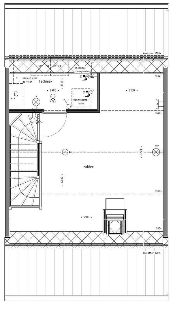 De tweede verdieping is bereikbaar via een vaste trap. Hier bevinden zich de technische installaties (zonnepanelen, warmtepomp en WTW-installatie) en extra bergruimte achter de knieschotten. Deze verdieping is ideaal als bergzolder of hobbyruimte.