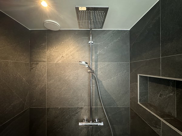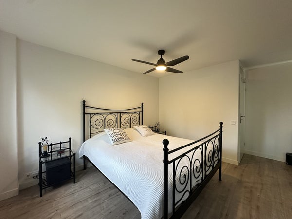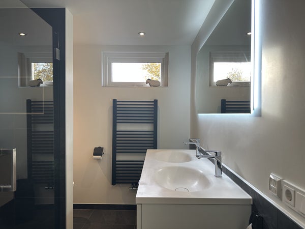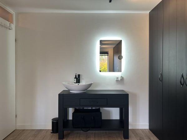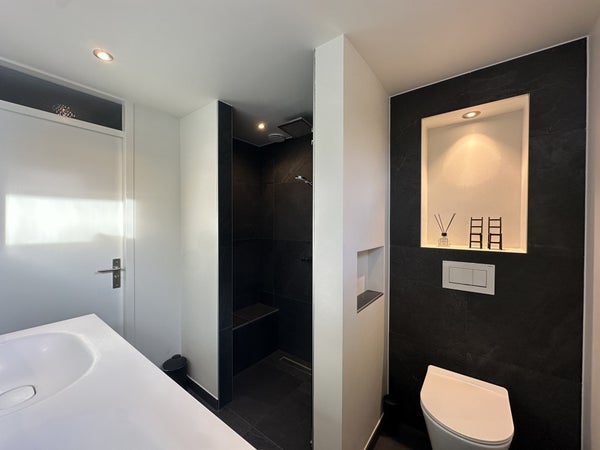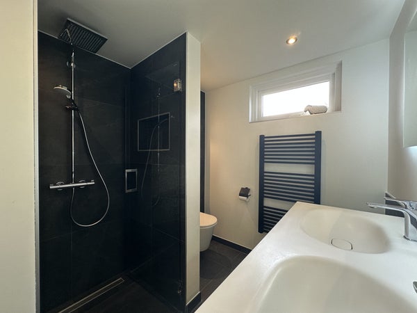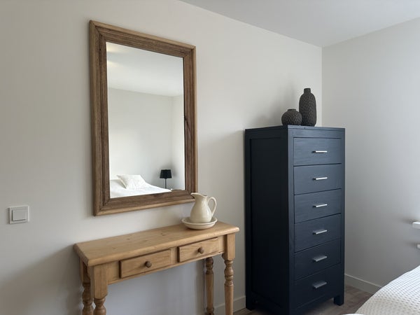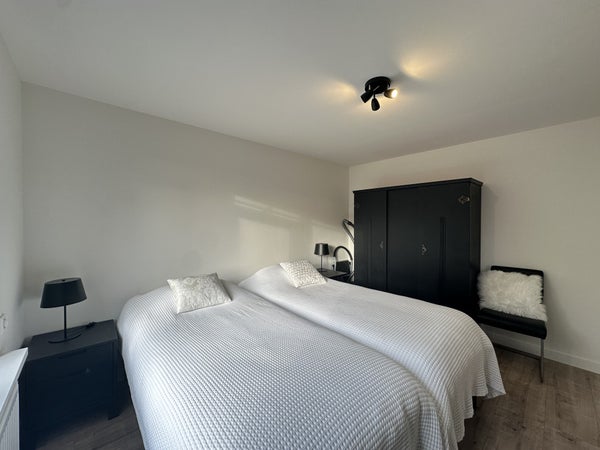 De hoofdslaapkamer ligt aan de achterzijde en is zeer ruim opgezet met een tweepersoonsbed, een volledige kastenwand en een wastafel met verlichte spiegel. De tweede slaapkamer beschikt over twee eenpersoonsbedden, kastruimte, dressoir en spiegel.De luxe badkamer is afgewerkt met witte muren en donkere natuurstenen tegels en is voorzien van een dubbele wastafel met meubel, ruime inloopdouche met zitbankje, verlichte spiegel, designradiator en tweede toilet.