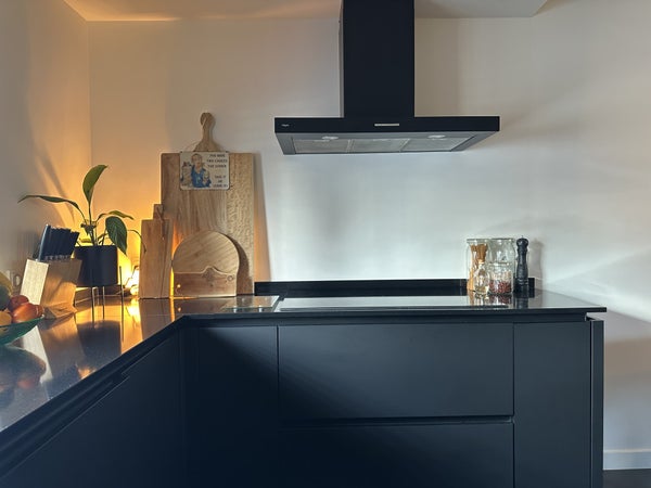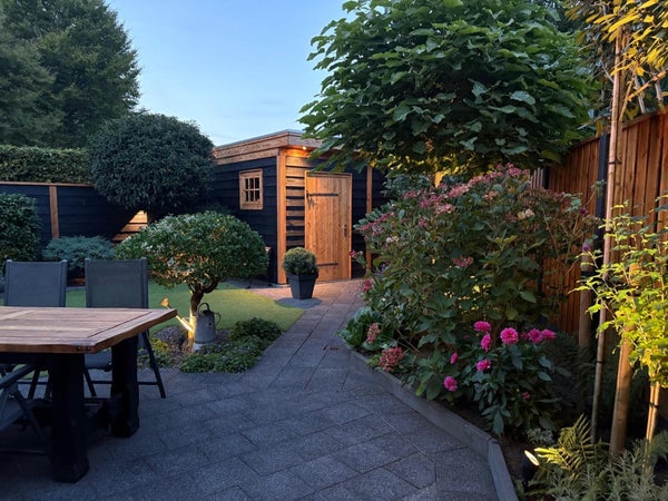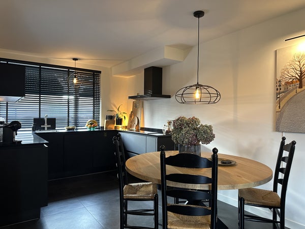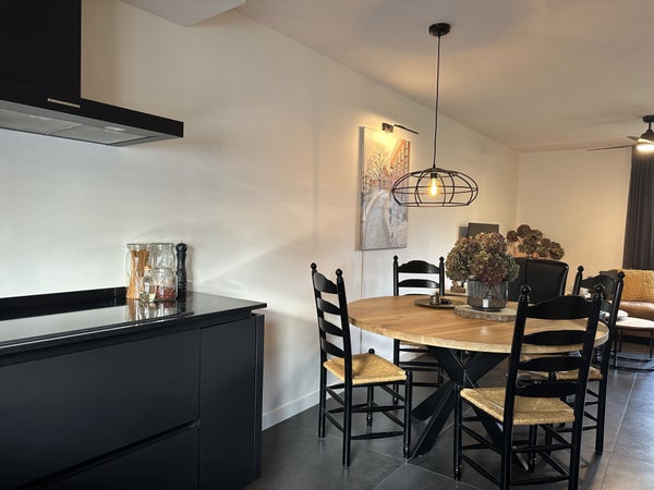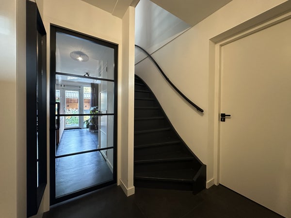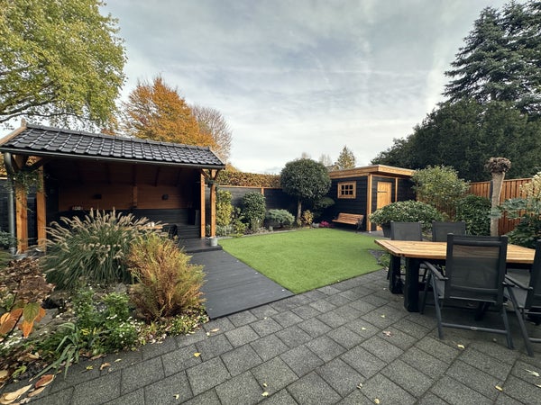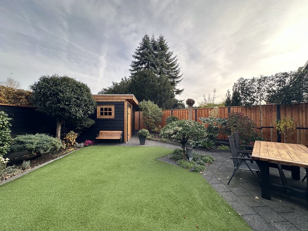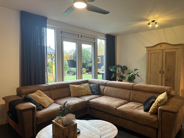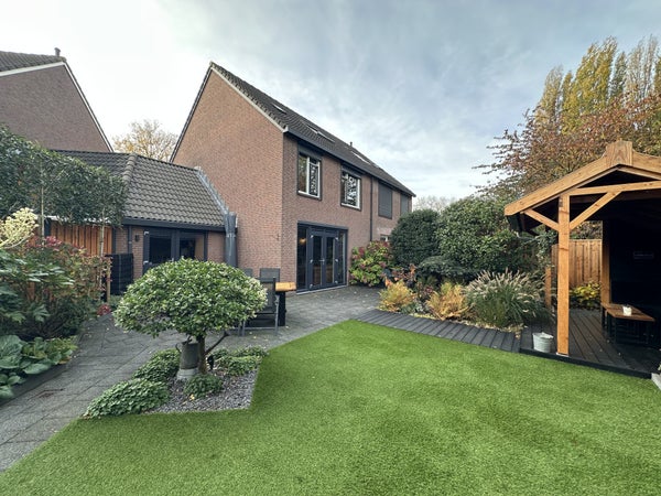 Indeling:Je komt binnen in de hal met met kapstok, separaat toilet, toegang tot de woonkamer, wasruimte en trap naar de eerste verdieping.De woonkamer met open keuken is ruim en sfeervol ingericht met een comfortabele zithoek, bestaande uit een royale hoekbank, fauteuil, tv-meubel en dressoir. De ronde houten eettafel voor vier personen vormt een sfeervolle overgang naar de moderne open keuken. De keuken is uitgevoerd in een strak zwart design en voorzien van hoogwaardige inbouwapparatuur, waaronder een vaatwasser, combi-oven/magnetron, inductiekookplaat, afzuigkap en koelkast.De praktische wasruimte beschikt over een wasmachine, droger, droogrek, schoenenkasten, vriezer en een wastafel. Vanuit de woonkamer en de wasruimte is er toegang tot de ruime achtertuin met volledige privacy. De tuin is voorzien van een overdekte zithoek, buiteneettafel en veel groen – ideaal om in alle rust te genieten van de buitenlucht.