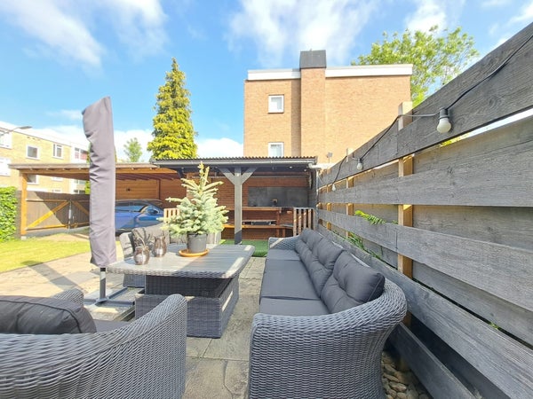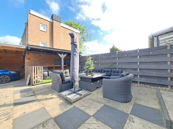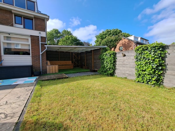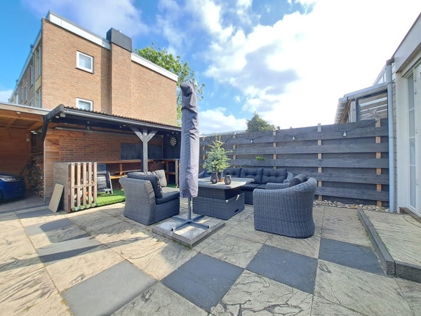 Vanuit de woonkamer kom je in de achtertuin waar genoeg plek is voor een gezellige bbq met familie en vrienden. Er is een lounge set aanwezig met heerlijke kussens. Vanuit de tuin heb je toegang tot je eigen royale schuur waar plaats genoeg is voor de fietsen en wat gereedschap. En aangrenzend de carport waar de auto droog op eigen terrein staat geparkeerd.