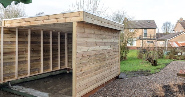 De ruim bemeten tuin is voorzien van een overkapping voor het opbergen van bijvoorbeeld fietsen.
