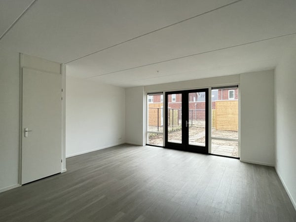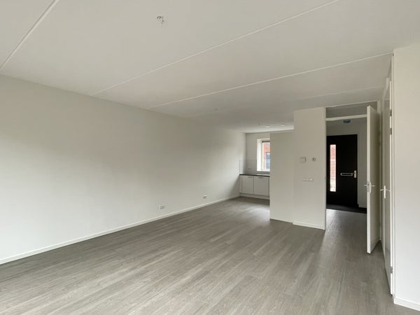 De woning is hoogwaardig afgewerkt met een moderne PVC vloer, een droogloopmat en witte plinten, en de wanden zijn voorzien van glasvlies behang.
