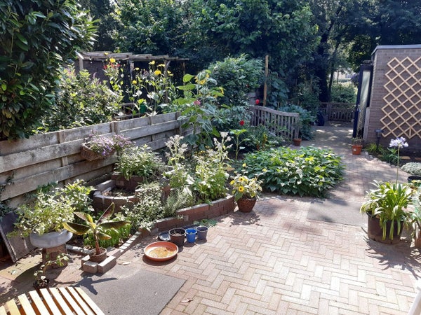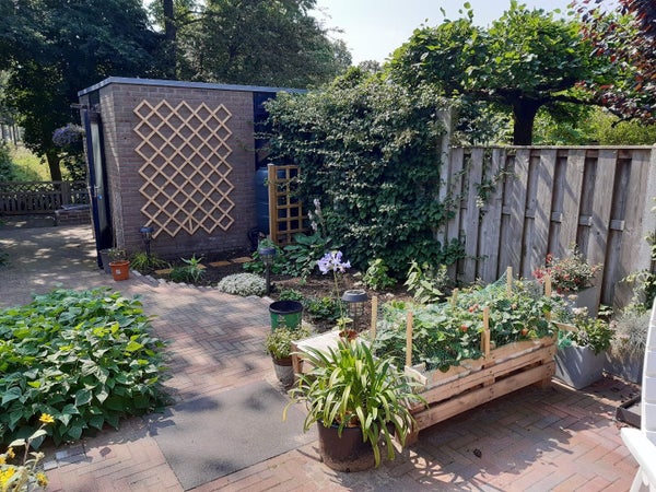 Tuin: De voortuin is geheel bestraat en heeft plaats voor 2 auto's. Achtertuin, gelegen op het zuiden is grenzend aan een groenstrook met water. Er is een achterom welke toegang geeft tot de stenen berging waar de fietsen gestald kunnen worden.