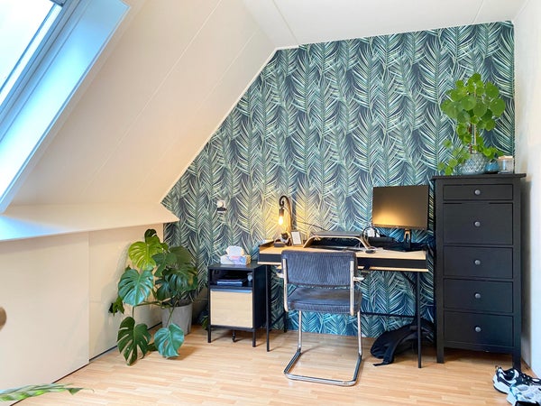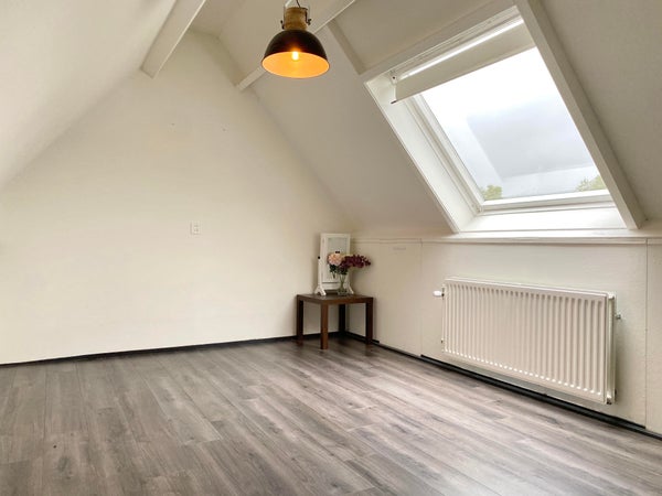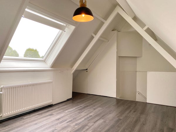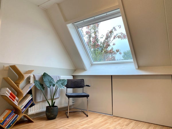Deze ruime slaapkamer geniet van veel lichtinval door het dakraam. De kamer biedt veel opbergruimte achter knieschot.