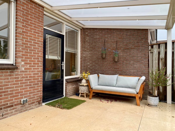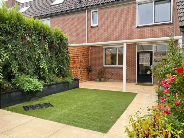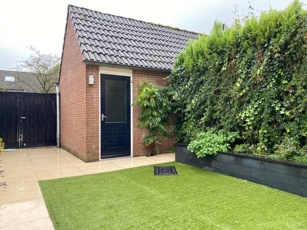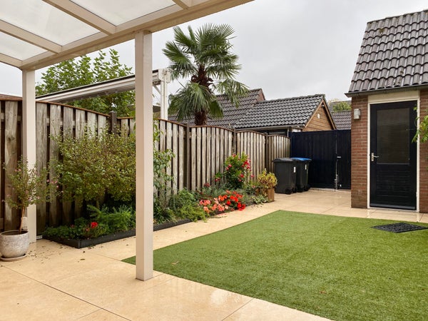 De diepe achtertuin gelegen op het zonnige zuiden is voorzien van een ruime overkapping, tuinberging en achterom.