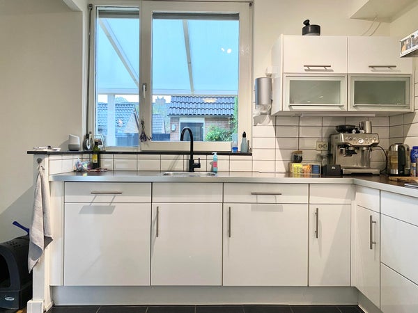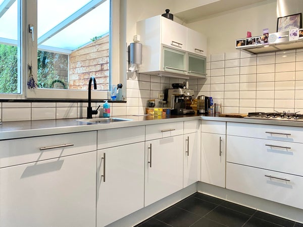 Ruime open keuken in L-opstelling voorzien van alle gemakken zoals een 5-pits gasfornuis, afzuigkap, vaatwasser, combimagnetron, koelkast en voldoende opbergruimte. Ook bevindt zich in de keuken een vaste bergkast met handige provisieruimte.