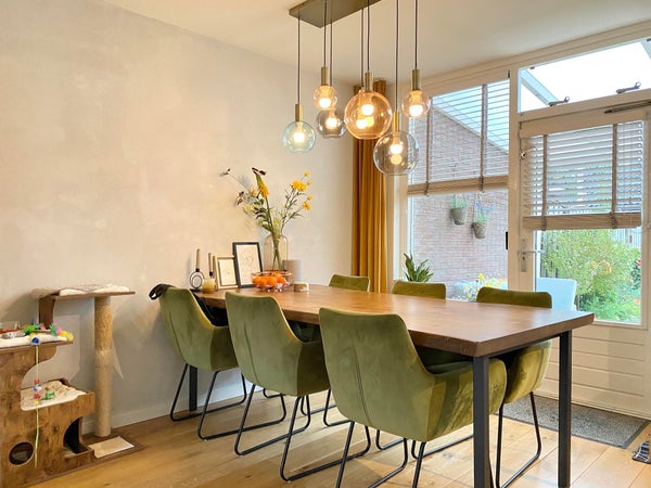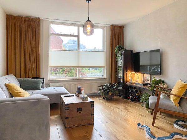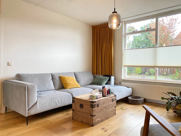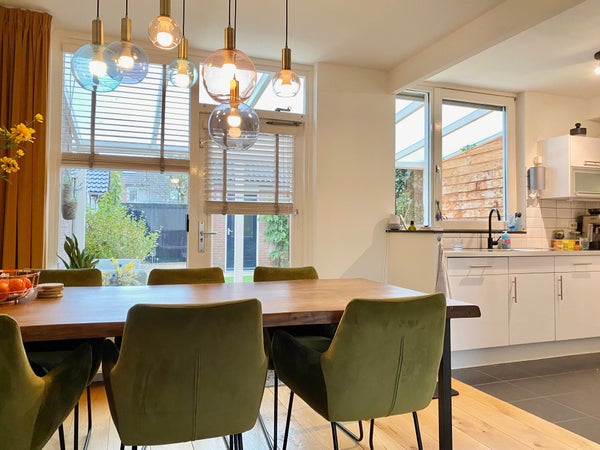 De woonkamer staat in open verbinding met de keuken en geniet een prettige lichtinval door de grote raampartijen evenals de deur naar de achtertuin.