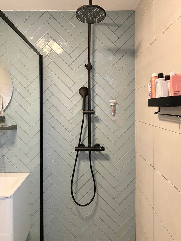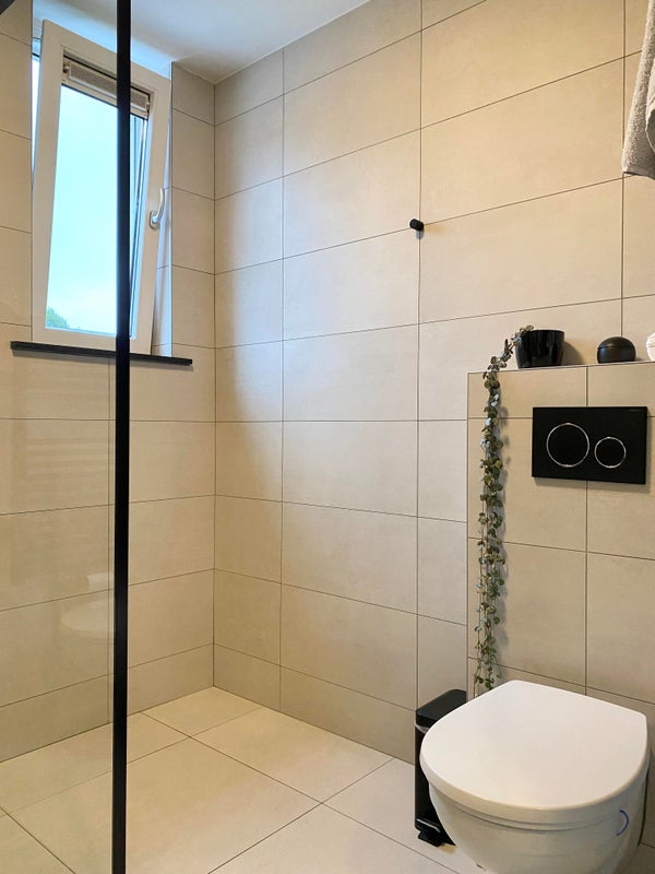 Deze volledig betegelde badkamer is onlangs gerenoveerd. De badkamer is uitgerust met een wastafel, wastafelmeubel, zwevend toilet, designradiator en een ruime inloopdouche.