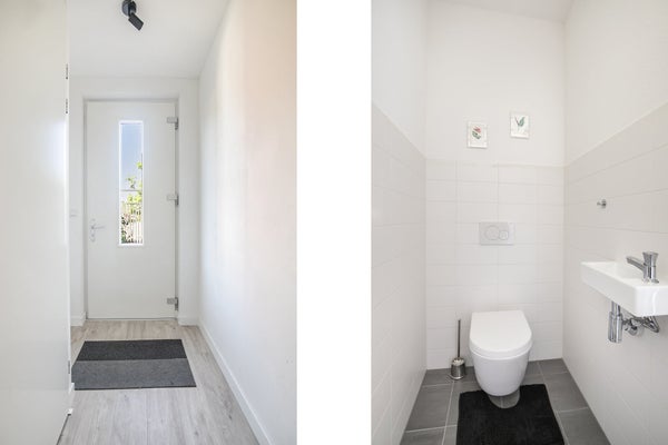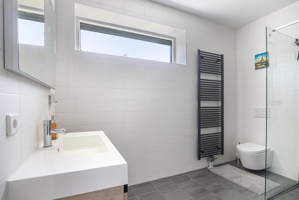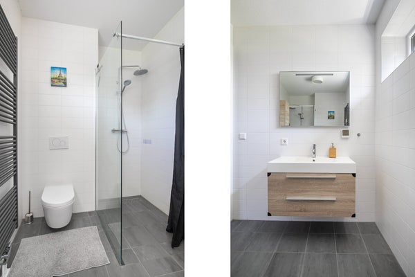 De ruime, moderne, geheel betegelde badkamer is aan de achterzijde van de woning gelegen en is voorzien van een ruime inloopdouche, toilet, wastafelmeubel en design radiator.