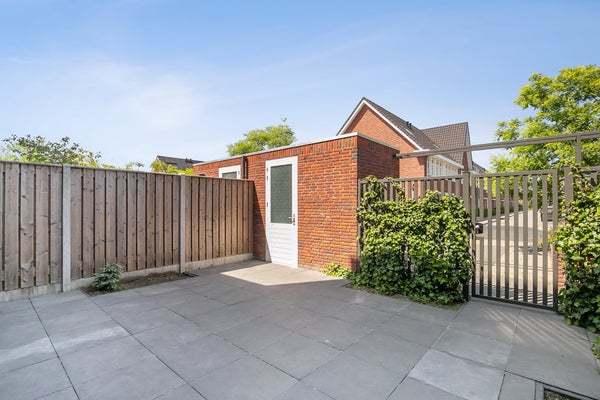 Via de poort (bediening op afstand via een schakelaar) toegang tot de geheel omheinde, strak aangelegde, onderhoudsarme voortuin met o.a. bestrating, borders met vaste beplanting en stenen berging (5m2) voorzien van elektra.