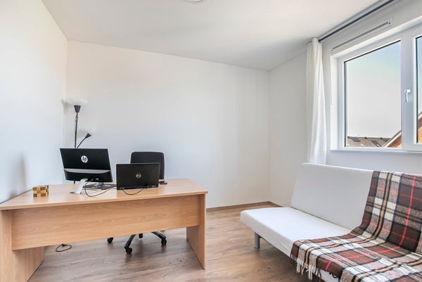 Via de trap in de woonkamer toegang tot 3 slaapkamers waarvan 1 slaapkamer is voorzien met een Frans balkon. De twee grote slaapkamers van 14.17m2 en 20.43m2 zijn voorzien van een tweepersoonsbed. De derde kleine slaapkamer van 8.42m2 doet nu dienst als werkkamer en is uitgerust met een bureau.