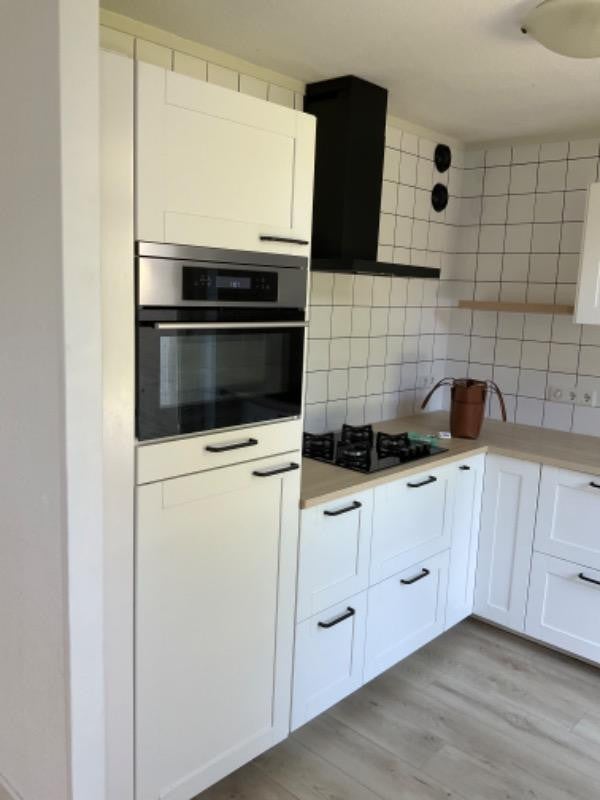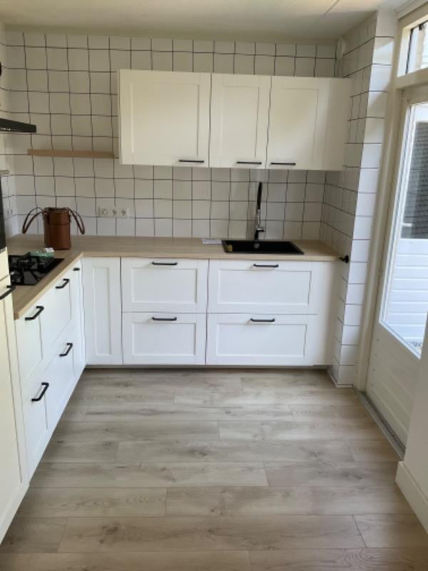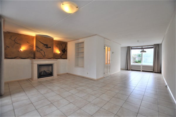 Royale woonkamer in u vorm, uitgerust met een laminaatvloer (nog niet zichtbaar op de foto's) en sierschouw met gashaard. Open keuken is geinstalleerd in 2023 en geplaatst in hoekopstelling, voorzien van alle benodigde apparatuur waaronder een vaatwasser, combioven, 4 pits gasfornuis met afzuigkap en wastafel. Achterdeur naar de volledig omheinde achtertuin met terras.