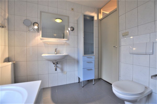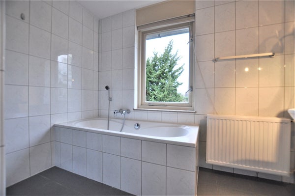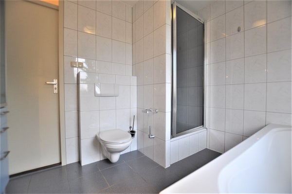Overloop met toegang naar de drie slaapkamers. Twee slaapkamers zijn voorzien van vloerbedekking de derde is voorzien van een laminaatvloer. Keurige badkamer met tweede toilet, wastafel, aparte douchecabine en ligbad.