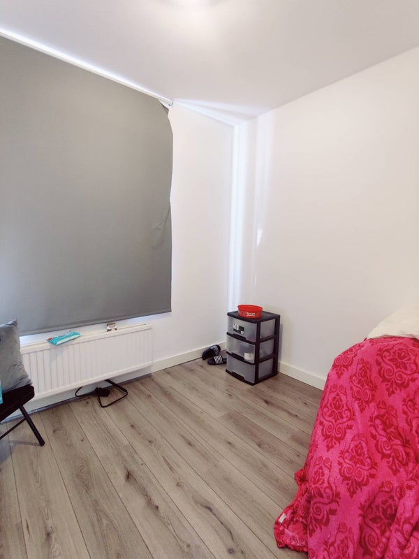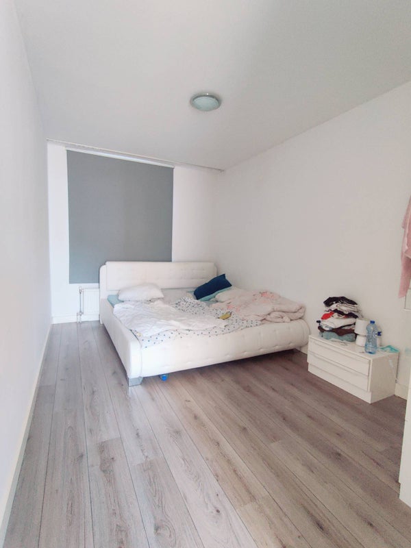 Deze slaapkamer is gelegen aan de voorkant en wordt momenteel gebruikt als ruime kastenkamer. De afwerking bestaat uit een laminaatvloer, geschilderde muren en een spuitplafond. Deze kamer heeft ook een groot kunststof raam met draai-/kiepsysteem.