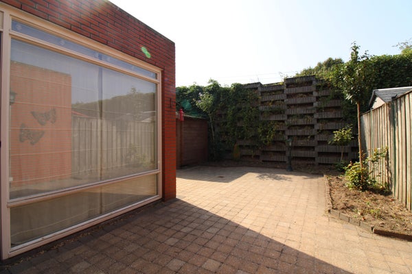 Onderhoudsvriendelijke tuin gericht tot het zuiden, toegankelijk vanuit de wijd openslaande deuren vanuit de woonkamer. Hier is een tuinhuis tot beschikking.