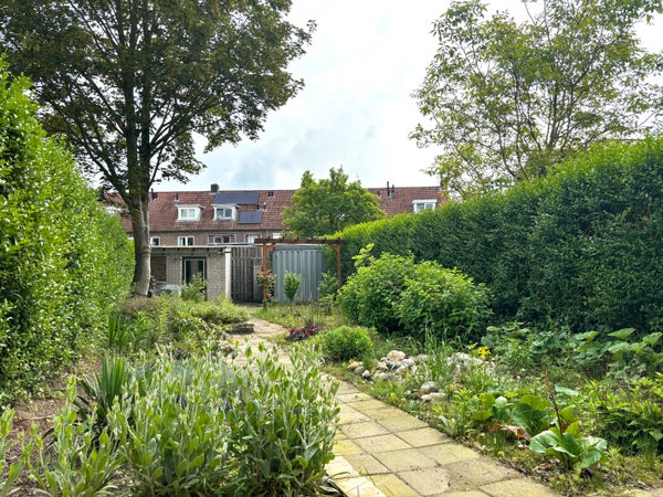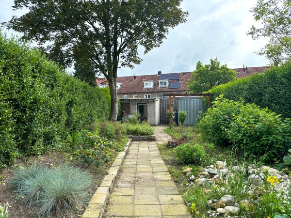 De diepe achtertuin, gelegen op het oosten, biedt een aangename buitenruimte met een schuurtje en achterom, perfect voor ontspanning en recreatie.