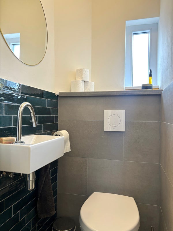 Bij binnenkomst vindt u een entree met toegang tot een gastentoilet, een handige trappenkast, de trap naar de eerste verdieping en woonkamer. De woonkamer geniet van veel natuurlijk licht dankzij grote ramen aan beide zijden. De aangrenzende keuken is compleet uitgerust met moderne apparatuur, inclusief een inductiekookplaat, vaatwasser, oven, koelkast en vriezer, en biedt directe toegang tot de ruime achtertuin. De begane grond is volledig voorzien van vloerverwarming