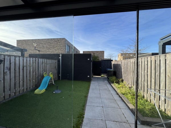 De tuin is voorzien van kunstgras in combinatie met bestrating. Achterin de tuin bevindt zich een berging, deze is ruim en biedt voldoende bergruimte voor de fietsen van een gezin.