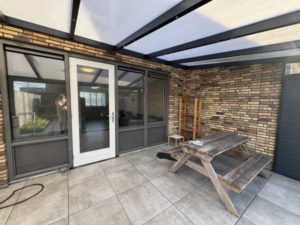 De kamer staat in open verbinding met de keuken en ligt aan de achterzijde van de woning. De achterdeur geeft toegang tot de overkapping welke kan worden afgesloten met een glazen schuifpui.