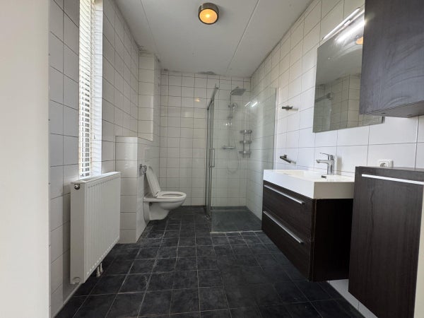 De badkamer is voorzien van een douche, wastafel met meubel en een tweede toilet.