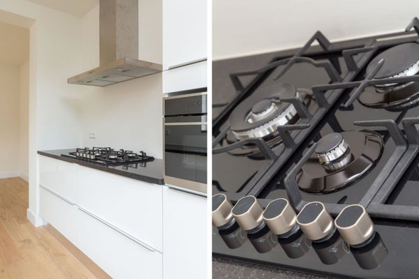 Moderne luxe Keuken: voorzien van allegemakken zoals: gasfornuis, afzuigkap, koel-vriescombinatie, combi-oven, vaatwasser en afdoende bergruimte.
