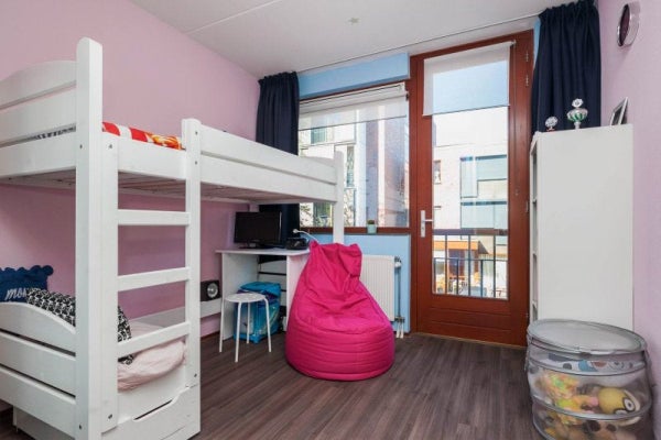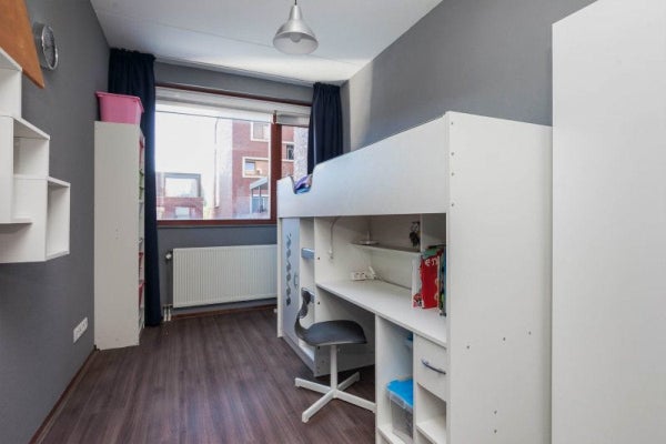 Slaapkamer 3, circa 9,5 m², is aan de achterzijde gelegen en is voorzien van een nette laminaatvloer en een draairaam. Hier bevinden zich tevens TV, radio en telefoonaansluitingen.
