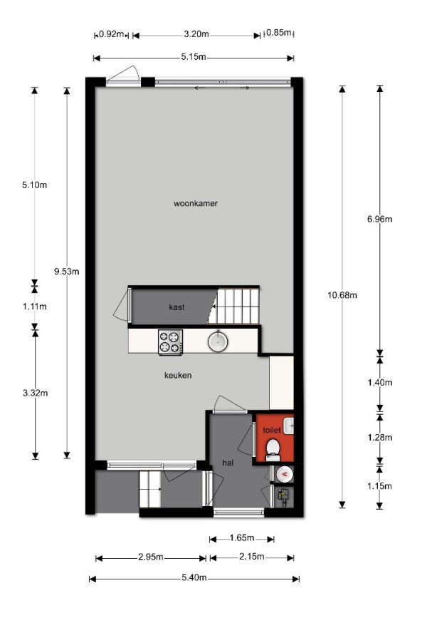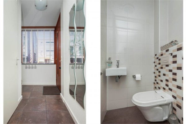 Balustrade met toegang tot de overdekte entree. In de lichte hal bevinden zich de meterkast (7 groepen) met stadsverwarmingsunit en de volledig betegelde en moderne toiletruimte uitgerust met een vrij hangend toilet en fonteintje.