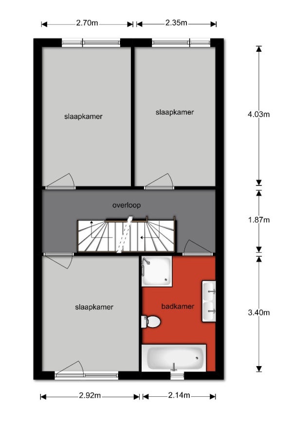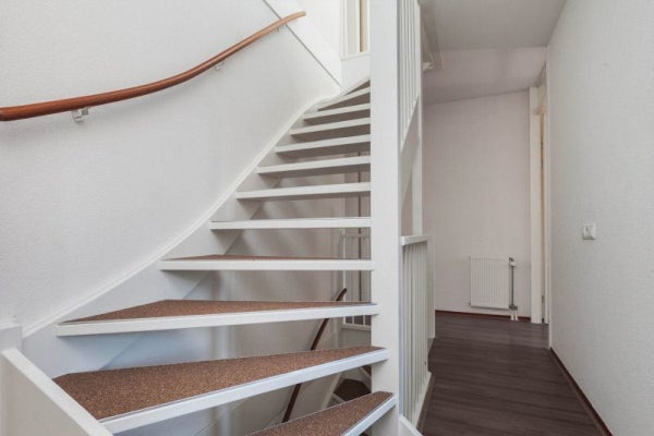 De overloop biedt toegang tot drie slaapkamers en de badkamer. De volledige eerste verdieping is voorzien van dezelfde laminaatvloer.