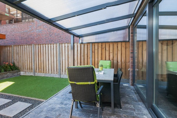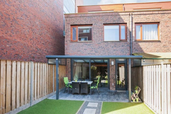 De onderhoudsvriendelijke en verzorgde achtertuin, gelegen op het oosten, is voorzien van een terras van natuursteen, een fijne terrasoverkapping met verlichting, kunstgras, borders met beplanting, buitenverlichting, buitenkraantje en elektra. Achterin de tuin staan een stenen berging voorzien van elektra en een grote carport met privé parkeerplaats. De poort biedt toegang tot een afgesloten gemeenschappelijk binnenterrein.