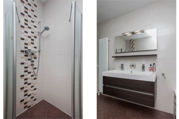 De volledig betegelde badkamer is uitgerust met een bad, inloopdouche, hangend toilet, designradiator en grote dubbele wastafel in meubel met planchet en spiegel.