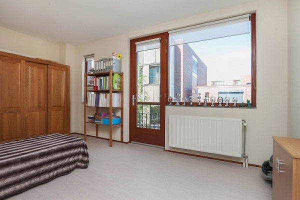 Slaapkamer 1, circa 10,5 m², is aan de achterzijde gelegen en is voorzien van een nette laminaatvloer en een draairaam. Hier bevinden zich tevens TV, radio en telefoonaansluitingen.