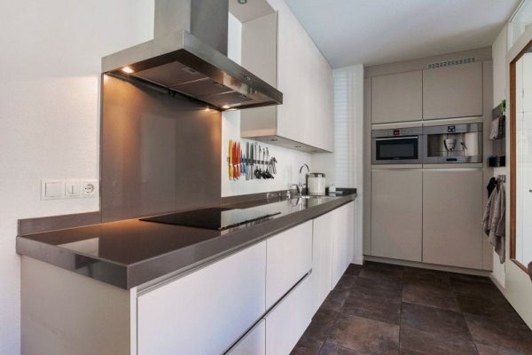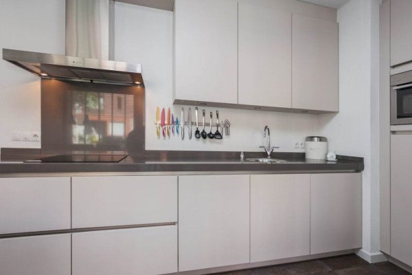 Aan de voorzijde is de royale woonkeuken gelegen. Deze is van alle gemakken voorzien zoals een composiet werkblad, spoelbak, geïntegreerd zeeppompje, inductiekookplaat, afzuigkap, combi oven/magnetron, ingebouwd koffiezetapparaat, vaatwasser, koelkast (allen van Bosch/Siemens/Liebherr). De diverse kasten en lades bieden zeer veel opbergruimte en er is genoeg plaats voor een eettafel. Via de keuken is een ruime en praktische trapkast te bereiken.