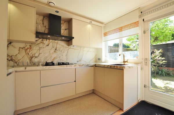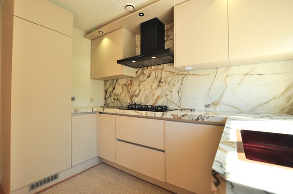 Aangesloten tot de kamer treft u de recent geplaatste half-open keuken, welke is uitgerust van alle gewenste gemakken, waaronder een vaatwasser, koelkast, vriezer, 4-pits gasfornuis met afzuigkap en in de naastgelegen berging treft u de combioven met nog meer bergruimte. Buiten deze toevoeging tot de keuken is hier ook een extra wastafel en handige bergkast met schuifdeuren geplaatst.