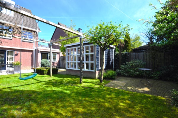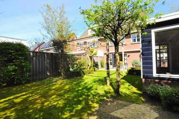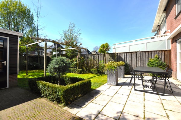 Prachtig groene tuin aan de achterzijde van het pand met zowel lage als hoge begroeing voor meer privacy. De tuin is uitgerust met een houten tuinhuis, een terras met grijze tegels en uitschuifbare zonwering.