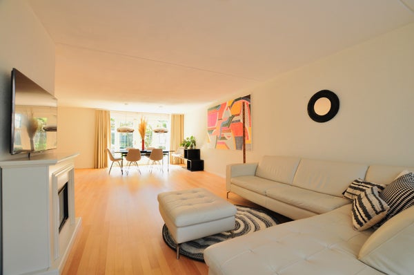 Ruime en lichte woonkamer met veel natuurlijke lichtinval, beschikkende over een parketvloer in lichte kleurstelling en een gashaard. Via de openslaande deuren aan de achterzijde kunt u het terras in de tuin bereiken, en ook is er een behendige berg- / provisiekast onder de trap.
