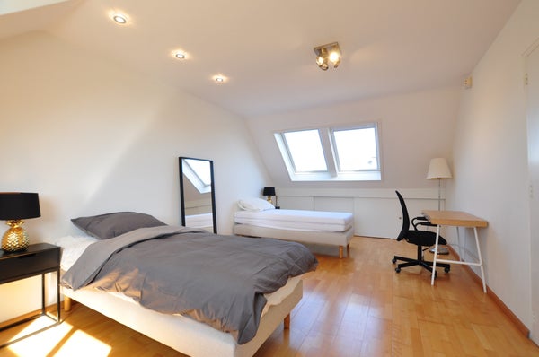 Royale zolderverdieping, beschikkende over twee eenpersoonsbedden die te schakelen zijn tot een tweepersoonbed. Het dakkapel en de ramen aan de voorzijde bieden veel lichtinval, waardoor het ook prima te gebruiken is als bijvoorbeeld thuiswerkruimte.