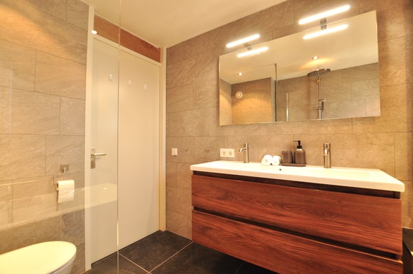 Aan de voorzijde van het pand vindt u de volledig nieuwe moderne badkamer, welke is uitgerust met een ligbad, inloopdouche, toilet en dubbele wastafel met ombouw.