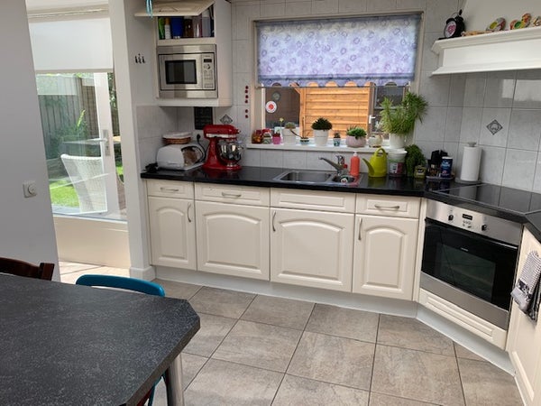 Nette keuken voorzien van inductie-kookplaat met afzuigkap, koelkast, vaatwasser en ingebouwde oven. De keuken beschikt over een deur naar de tuin.